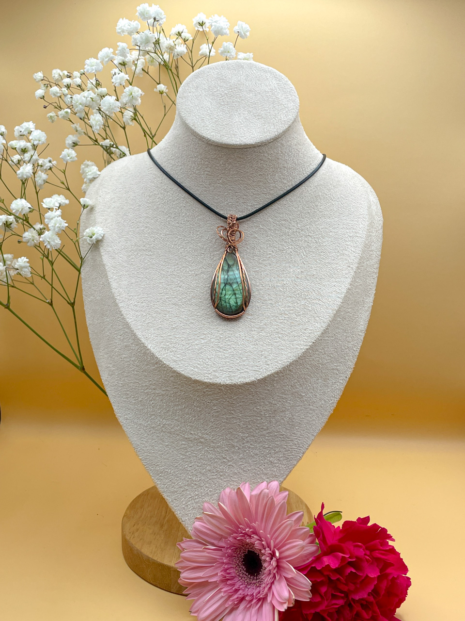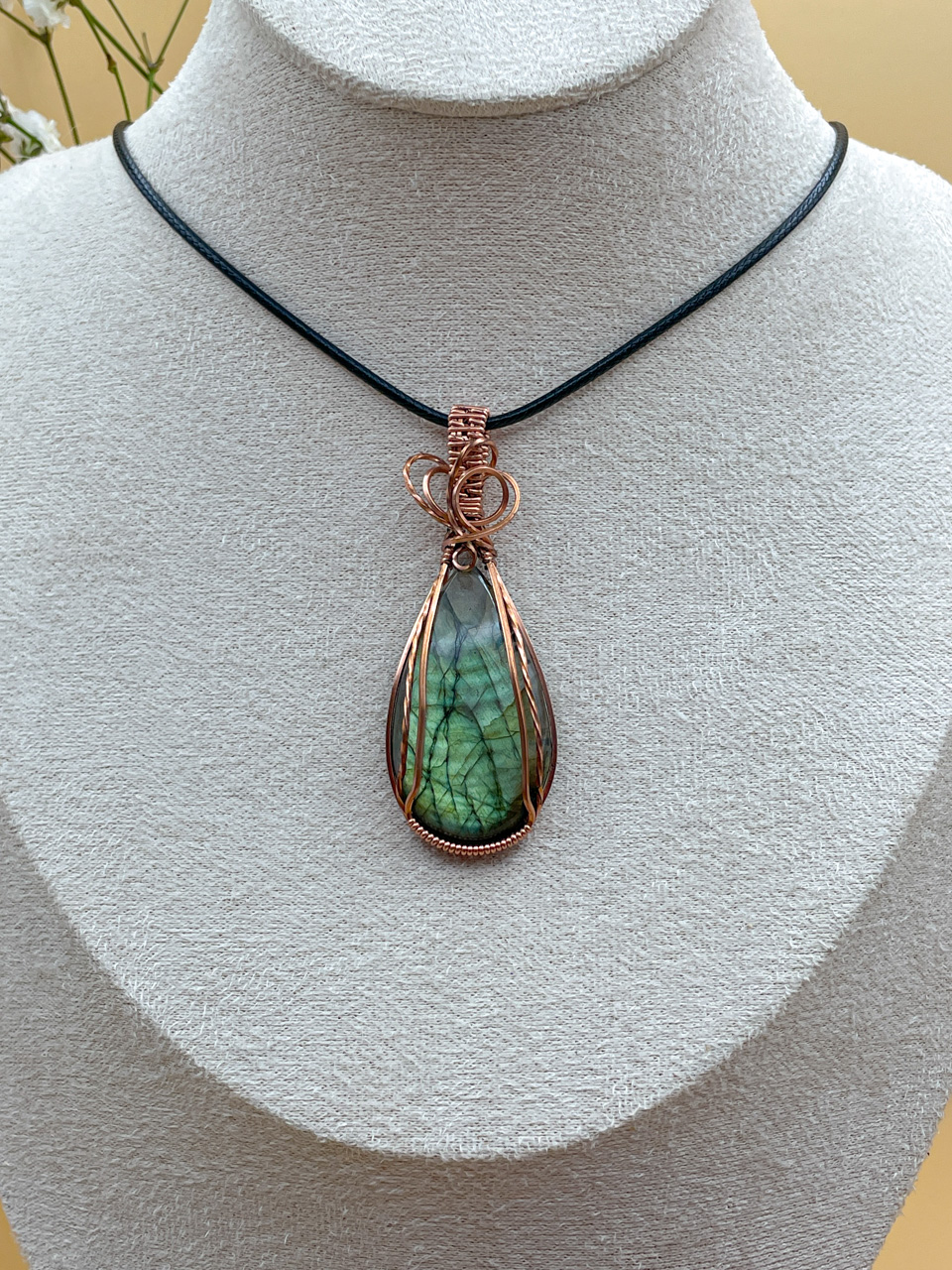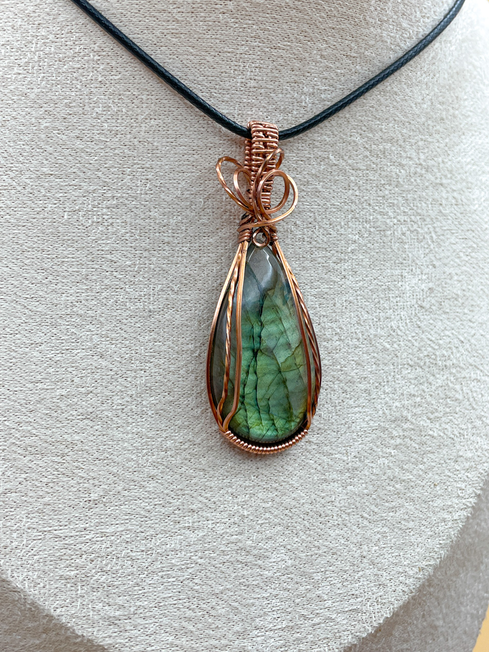Velikost kamene včetně drátku: 2,3x6x0,7 cm. Přívěsek bude na voskované černé šňůrce.