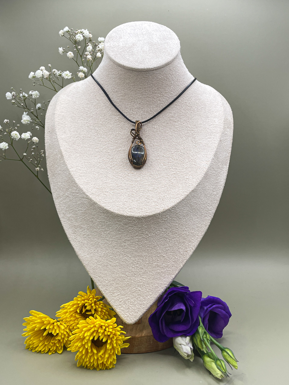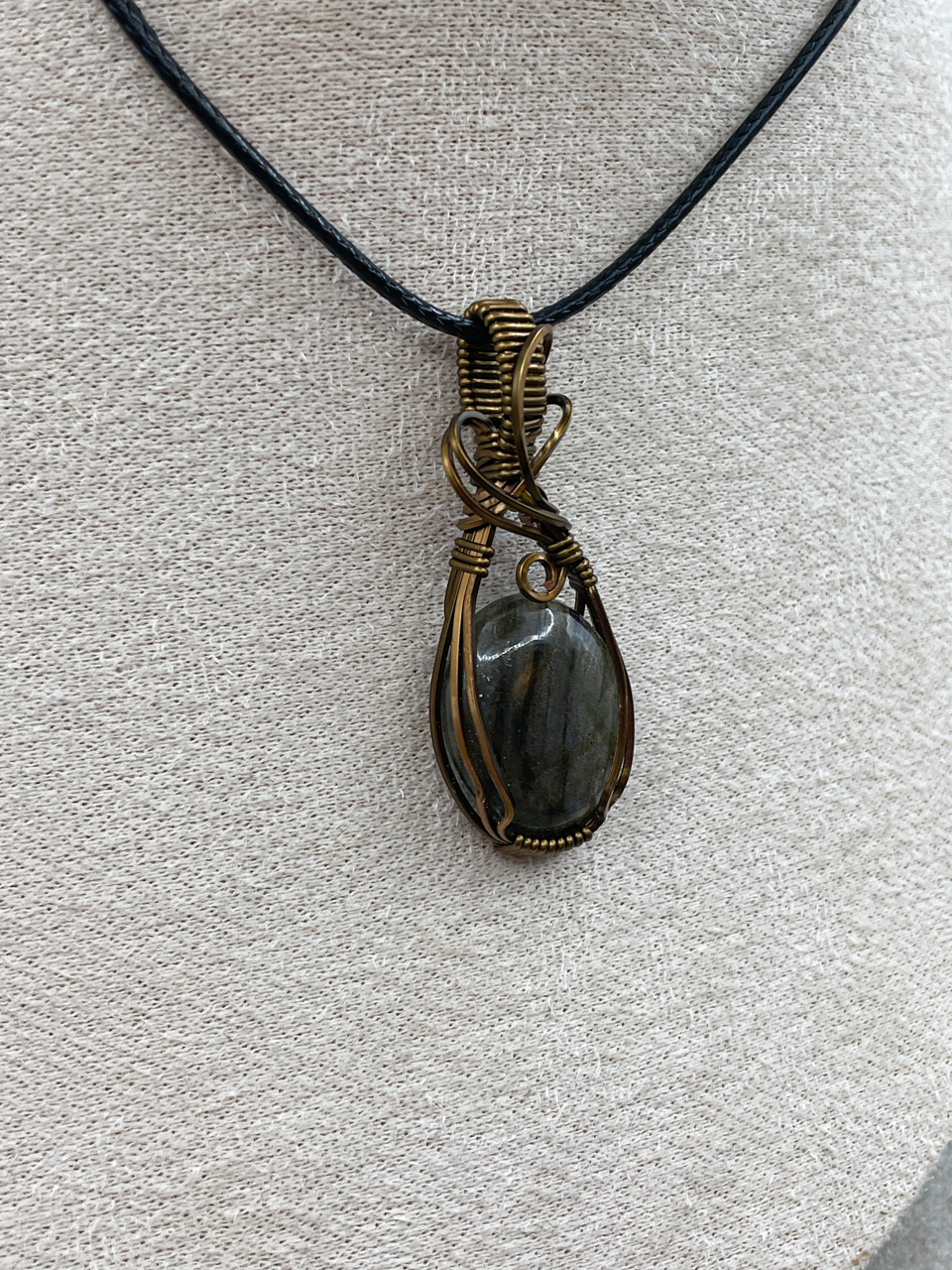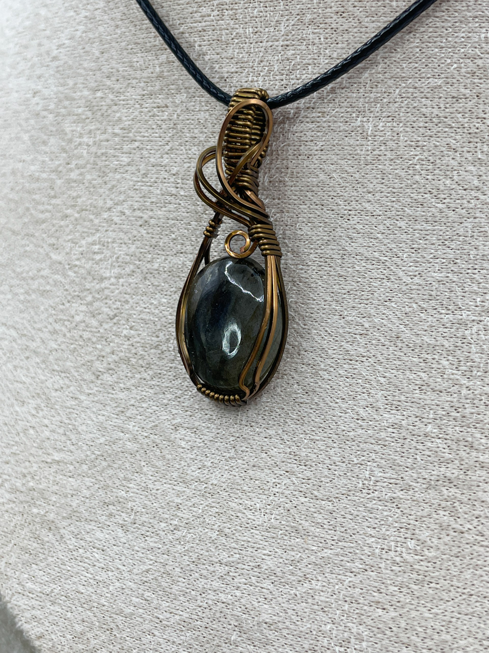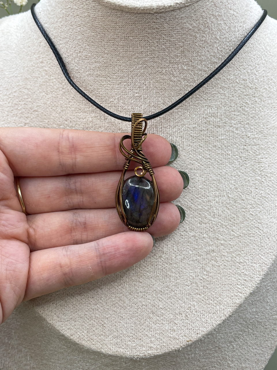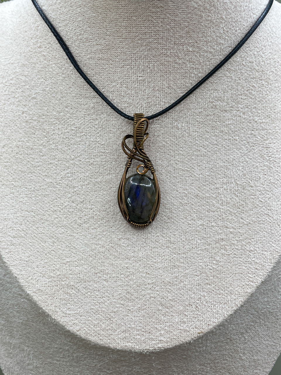 Velikost kamene včetně drátku: 1,7x4,5x0,6 cm. Přívěsek bude na voskované černé šňůrce.