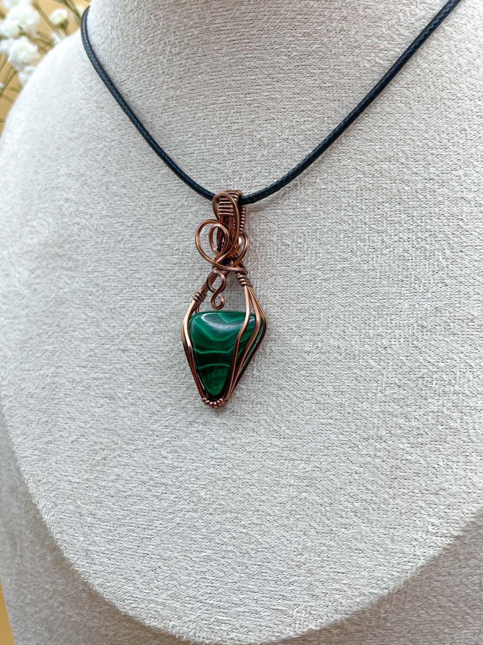 Velikost kamene včetně drátku: 1,8x4,6x0,6 cm. Přívěsek bude na voskované černé šňůrce.
