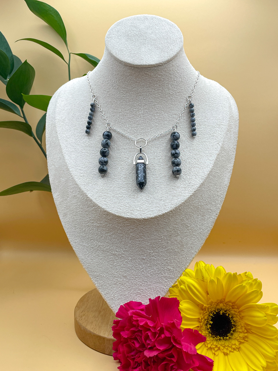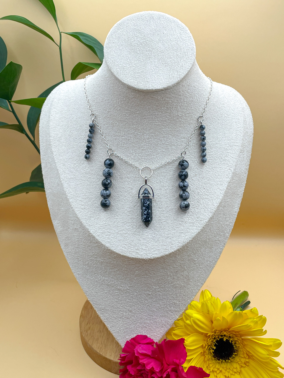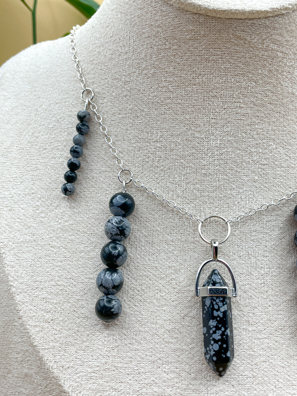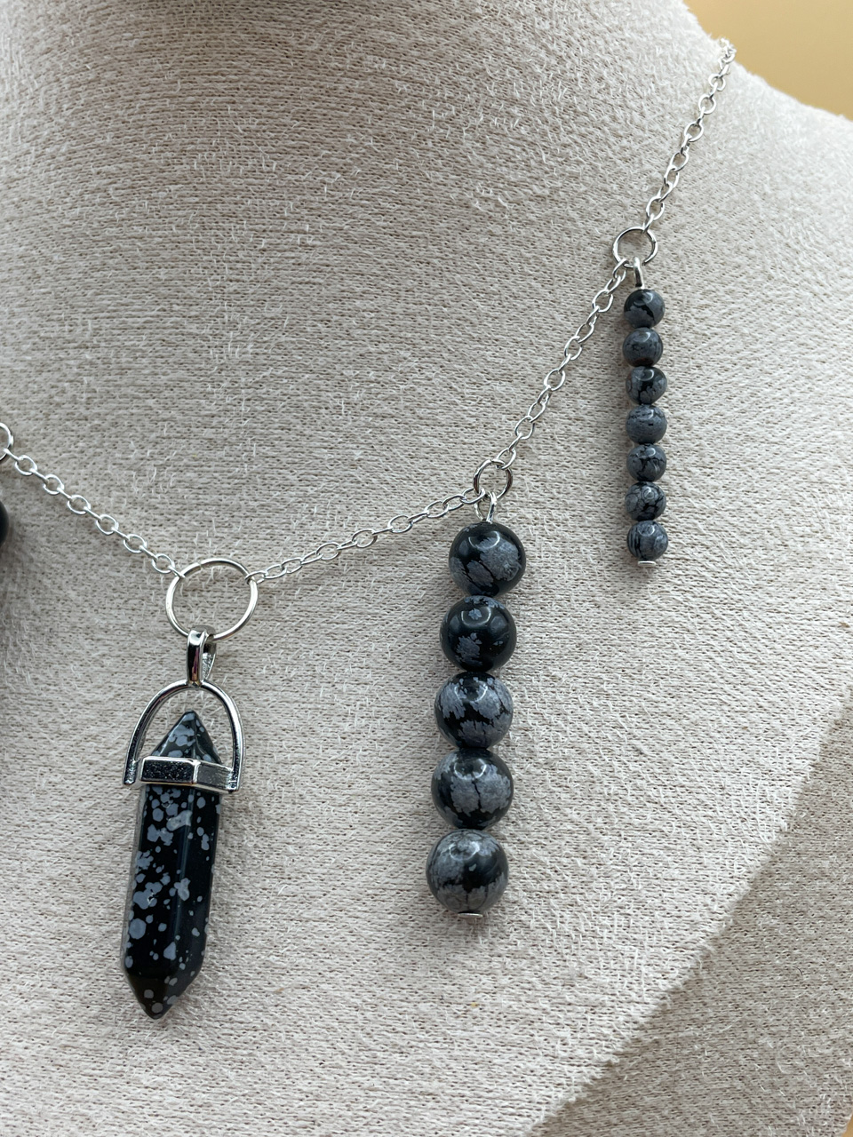 Náhrdelník ve stříbrné barvě s korálky z Obsidiánu vločkového. Délka řetízku 35cm (po přívěsek 44cm) + 7cm prodlužovací řetízek (není započítán v celkové délce).