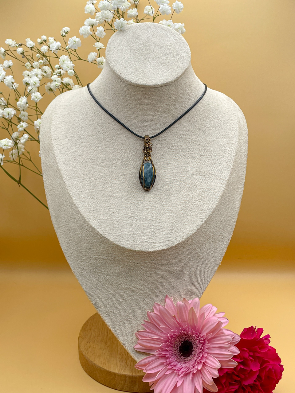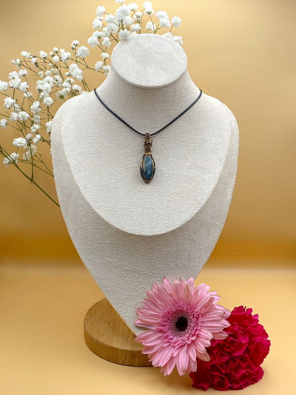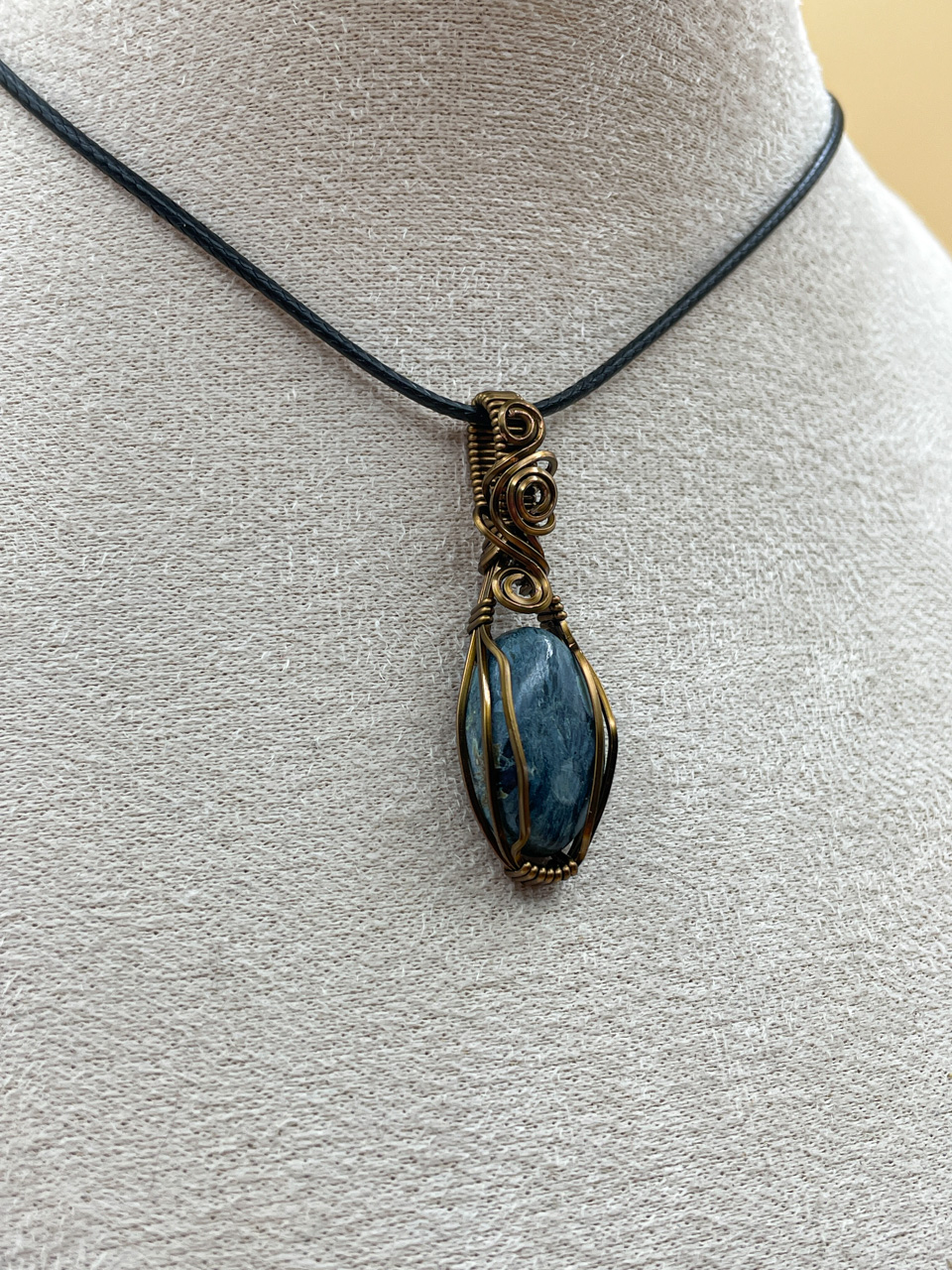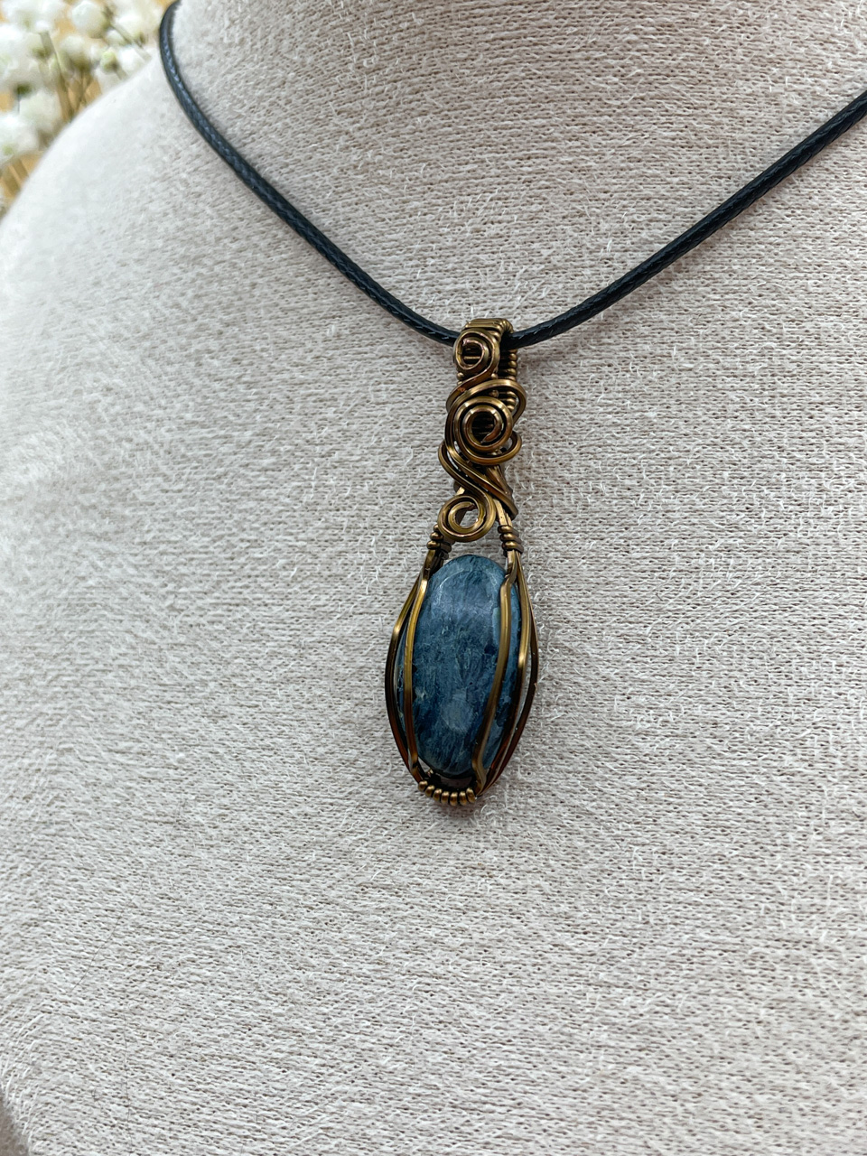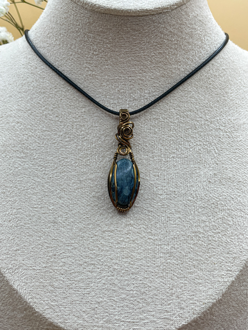Velikost kamene včetně drátku: 1,7x4,7x0,7 cm. Přívěsek bude na voskované černé šňůrce.