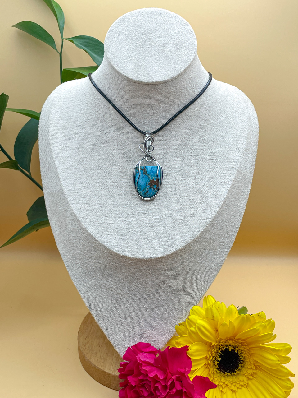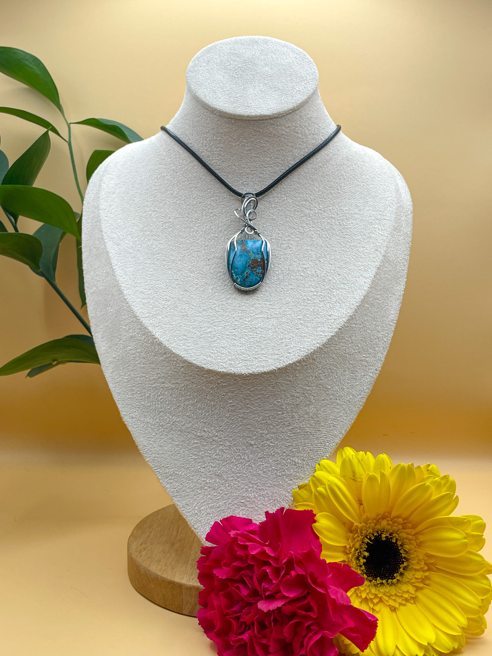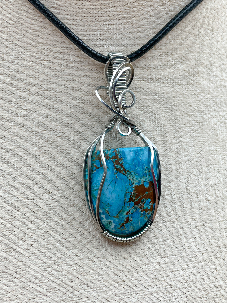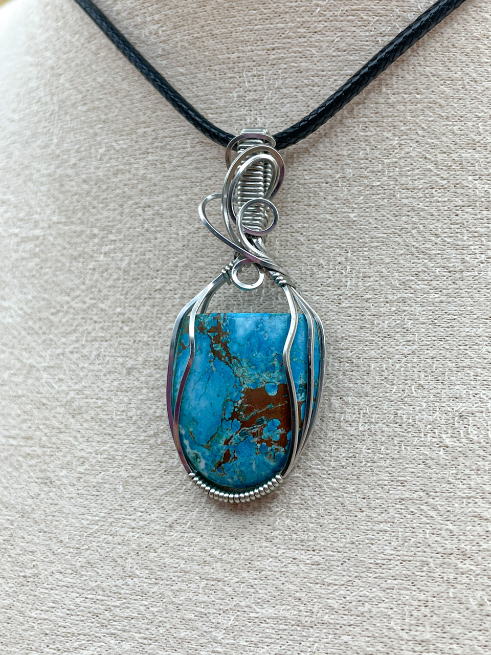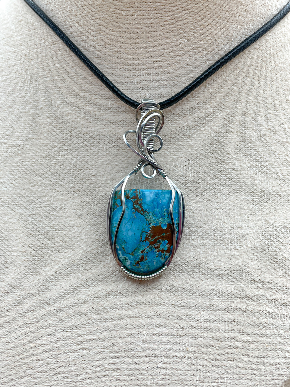 Velikost kamene včetně drátku: 2,4x5,5x0,6 cm. Přívěsek bude na voskované černé šňůrce.